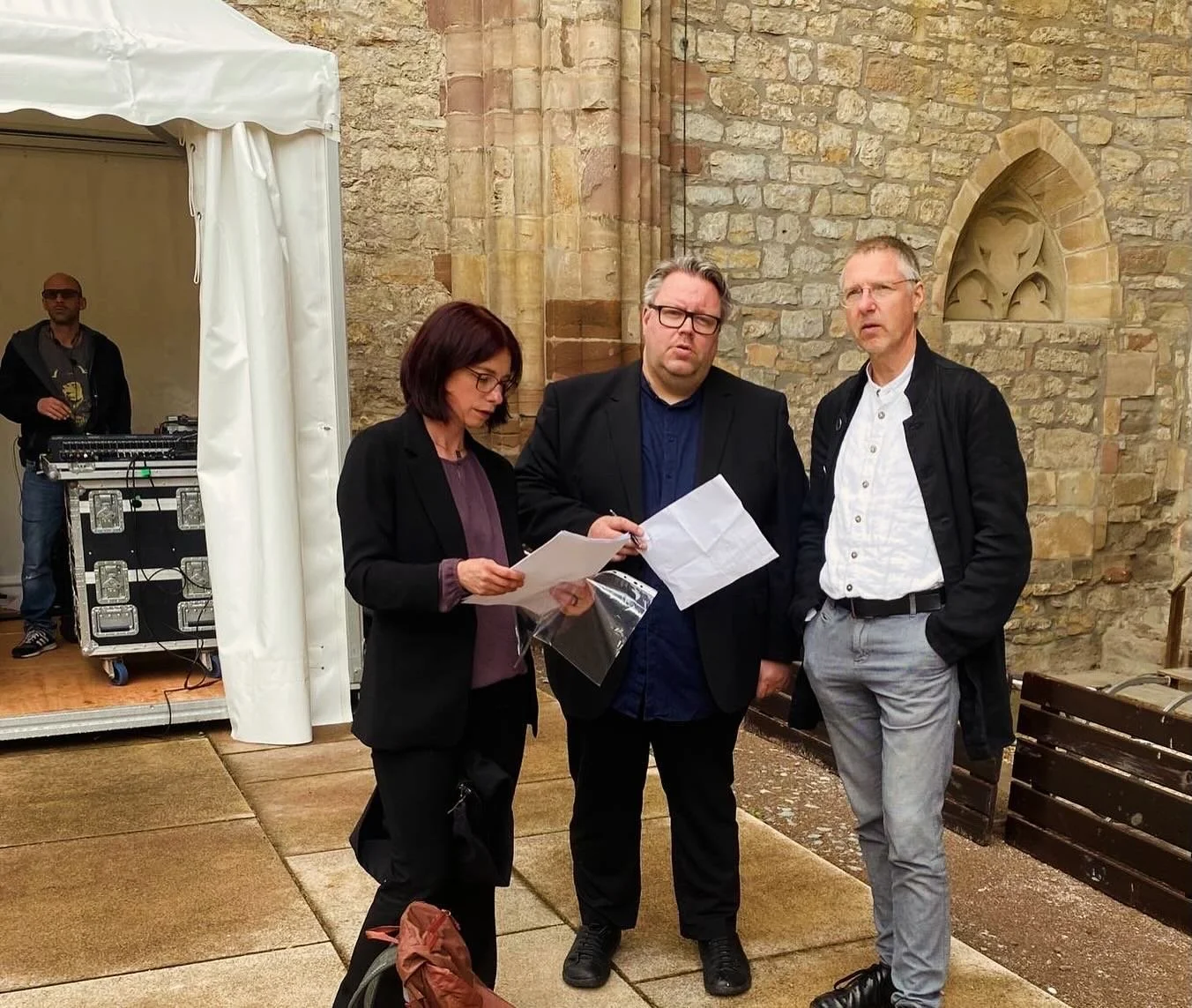 … “über Engel, den Osten und andere Ungesehene” am Nachmittag des 30.05.2024 in der Barfüßeruine Erfurt – tolle Kulisse, wunderbare Kollegen: Christian Lehnert (Leipzig) mit mir am Mikro und Uwe Steinmetz (Berlin) am Saxophon. Danke euch beiden und dem Organisationsteam des Katholikentags!